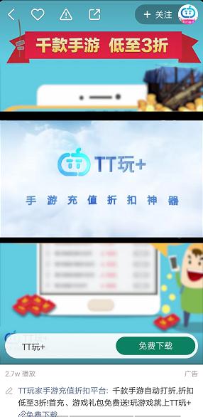 说完TT玩+的优势了,该来说说它在的案例了。 TT玩+投放的快手广告的封面是腾讯专区,手游充值低至3折,道具100元,者需支付30元,并且可以自动打折。 这样的封面比较吸引游戏爱好者,一般针对男神,潜意识中,都会有一种感觉就是玩游戏一般都是男生,女生玩的晒,即使玩了也很少有充值游戏的。而且外层的封面有一个缺点,就是看起来太杂乱,给用户的视觉效果不太好。 点击进入广告之后,视频会自动播放,视频内容就是介绍TT玩+是一个怎样的平台以及优惠信息,,落地页设有“免费下载”按钮,用户点击之后会自动下载APP,或者视频的下方文案里有“免费下载”的链接,点击之后也是会住宅微信推广软文直接下载,非常方便。