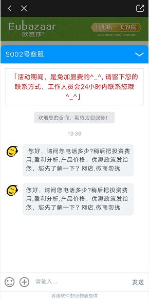 欧芭莎美容护理体验馆首次全国招商,免费加盟,欧芭莎本就是一个知名品牌,本身就有着一定的品牌效应,“免费加盟”吸引用户点击。 落地页介绍欧芭莎可以提供的服务以及加盟欧芭莎的优势,下方通过用户填写表单的形式收集意向用户的客资,落地页的右侧有“咨询”,拍摄广告短视频在固定时间内,咨询会自动弹出对话,用户予以回复可以与用户直接线上沟通,减少用户的跳出率。