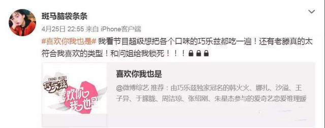 炎炎夏日。不妨看看巧乐兹做的吧!由巧乐兹独家冠名的爱奇艺恋爱综艺《喜欢你我也是》已经播出了三期,获得网友一致好评,大家纷纷表示每期都被甜到心坎了,更抱怨怎么才一个多小时,根本不够看,官博下面也被催更留言刷屏。 节目为了响应网友的催更,贴心的将原本每周四的更新提前到周三中午12:00,让粉丝提早沉浸在甜甜氛围里。