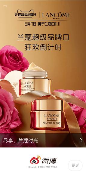 点击进入广告之后,落地页直接跳转到兰蔻的天猫店铺的首页,增加兰蔻店铺的访问量,同时让用户了解更多兰蔻的产品信息以及活动信息,便于粉丝了解兰蔻的各种商品,收藏加购,活动当天可以直接购买。 微博粉丝通开屏广告的优势在于有很强的曝光效果,在开屏广告的几秒时间里,用户的注意力比较集中,此时对于广告的记忆力比较好,加上广告海报的优惠信息,更容易引起用户的兴趣。而且开屏广告是用户进入微博时无法避免的,所以曝光量非常强,用于品牌b2b营销数字化的推广,或者大品牌的活动推广都是不错的选择,还会帮助品牌挖掘潜在客户。 天猫与各行业品牌进行战略合作,树立货品、营销、服务、销量几个综合维度的标杆品牌,打造行业大事件,此次天猫和兰蔻联手,帮助兰蔻打造品牌和销量双丰收的超级品牌日,吸引粉丝客户,挖掘潜在客户,所以,小伙伴们,为了不等到双十一,在此次的兰蔻天猫超级品牌日有什么想买的抓紧买吧~