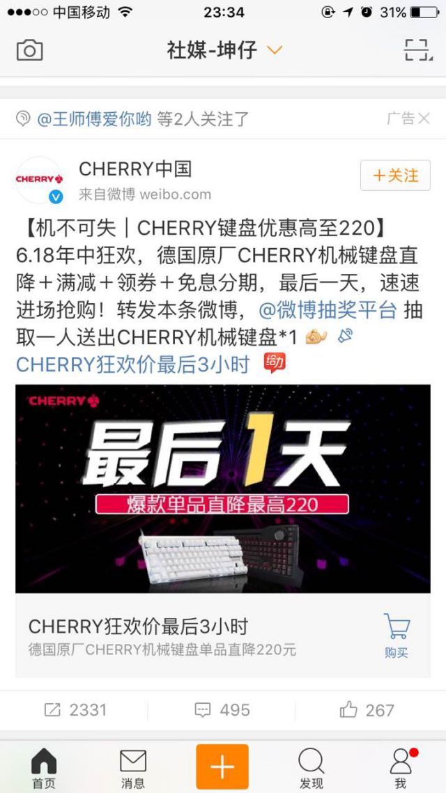 广告案例示意图 广告主通过的微博粉丝通广告案例宣传的就是自己的优惠活动,用户可以通过这一广告博文进行cherry键盘的抢购,并且在最后一天进行抢购,还能享受优惠,优惠价格最高可达220元。广告主先是通过最高优惠可达220元来引发用户对cherry键盘,对此次的优惠活动引发关注,其次就是通过让用户转发博文可有机会获取cherry机械键盘来让广告博文的覆盖范围更广,并且用户之间的自发传播范围效果都能得到较好的保证! 广告落地页的选择上就是cherry的淘宝活动页面,页面上还有别的优质产品,用户喜欢也可以进行相应的产品购买。 以上就是cherry中国投放的微博粉丝通广告案例了,那么我们在通过微博粉丝通广告来做相关的产品推广时,我们应该注意哪些内容呢? 1.产品要具有实用性,且产品是日常生活中不可缺少的内容; 2.既然投放了微博粉丝通广告,那么我们的营销活动要给用户一个行动理由,给用户一个购买动机,比如优惠折扣、满减等等; 3.微博上的内容会具有娱乐属性,所以我们广告文案的发展方面更多,我们也可以通过明星、微博大V来做借势营销,在碰到节日、当下热点我们品电商运营提出牌广告主也可以巧借势!