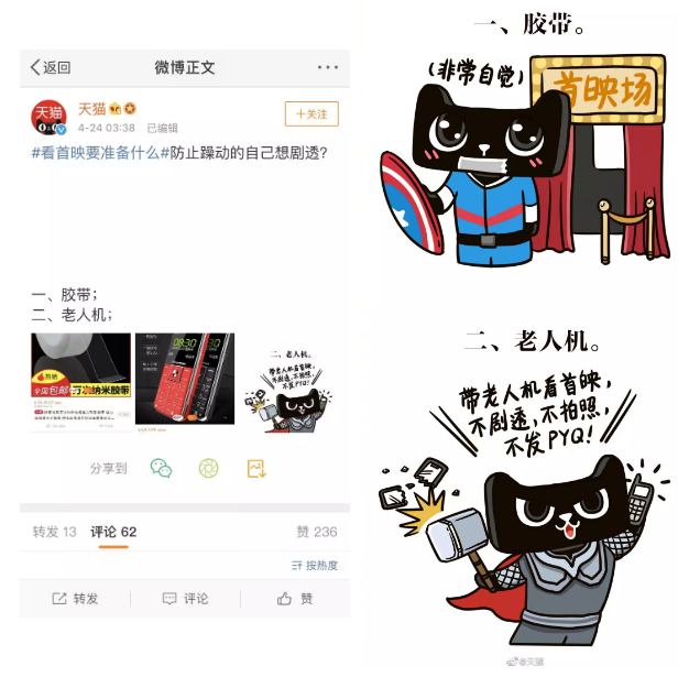 无论是联合电影推出周边产品,海报借势,亦或是“抖机灵”式的观影必备,品牌所希冀的,都是以此建立与影迷的连接,突发事件中的危机公关策略将电影流量转化为品牌流量。基于快速的热点聚合能力和丰富的用户UGC,微博能够助力品牌迅速把握热点,通过调侃或卖萌等方式,以“人格化”的行为与用户进行实时沟通,以此拉近彼此之间的距离,实现情感共鸣。