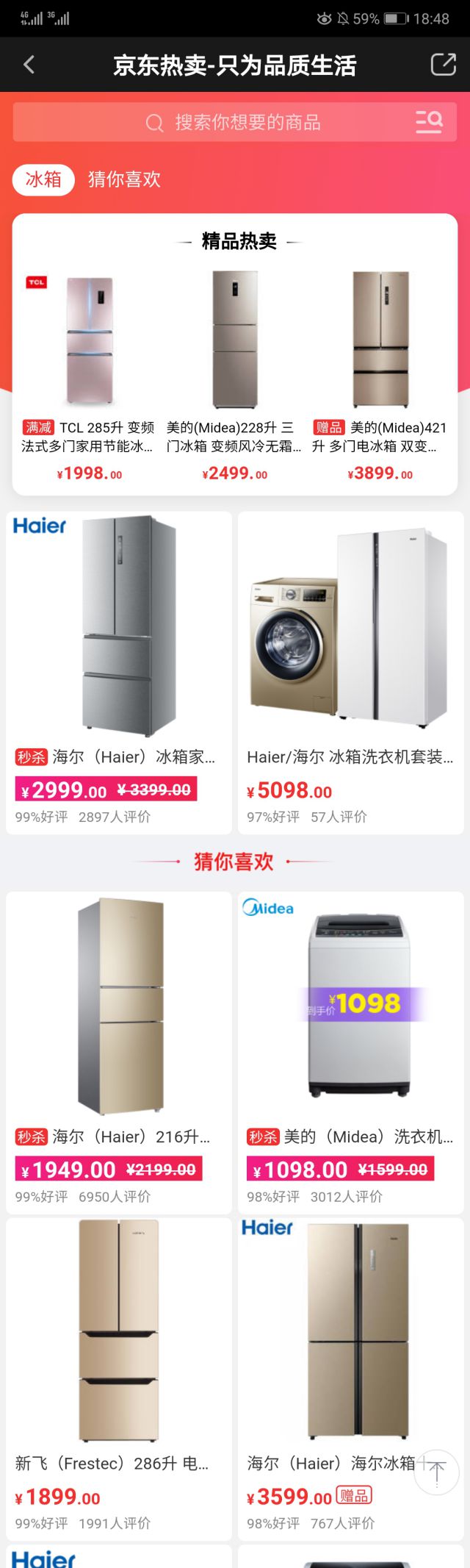 点击广告文案/广告图片,都会进入广告主的推广链接——一个大冰箱世界! 在广告落地页中,广告主实际是推广一个活动页面,而在这个活动页面中,都是各个不同容量的冰箱,我们可以根据自己的预算来进行冰箱的选择! 除了有冰箱以外,还有常用的家用电器等等,比如洗衣机等等之类的。在用户们进行冰箱的选择以后,还有优惠可享,在广告落地华邑品牌数字营销页中,就有原价和现价的标识,对比也就更加清晰!