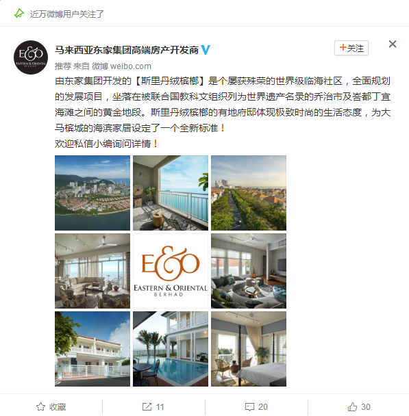 广告案例示意图 这是马来西亚东家集团,一个高端的房产开发商投放的广告,广告主的广告文案主要是跟大家介绍最新开发的房产项目,在广告文案的内容就是描述了房产的地理环境优势! 广告配图则是选择新开发房产项目的外部环境、室内环境+企业品牌logo! 在广告文案有引导用户私信小编的内容,这一内容也是企业引导用户对广告内容进行互动! 以上就是房产行业投放微博粉丝通广告的案例~ 我们在通过投放微博粉丝通广告案例时,可以展现更多企业品牌的信息,如果我们要做房产行业的广告投放,我们也可以通过对房产的外部绿化、交通位置、名校等内容进行推广,房产行业投放微博粉丝通广告,也可以通过广告落地页添加“表单”,通过“表单”了解用户的潜在需求、联系方式等等。 房产行业微博粉丝通广告投放,可以找我们进行合作,我们也会帮你设计专门的广告推广内容,还可以帮你做好广告账户优化运维等内容!
