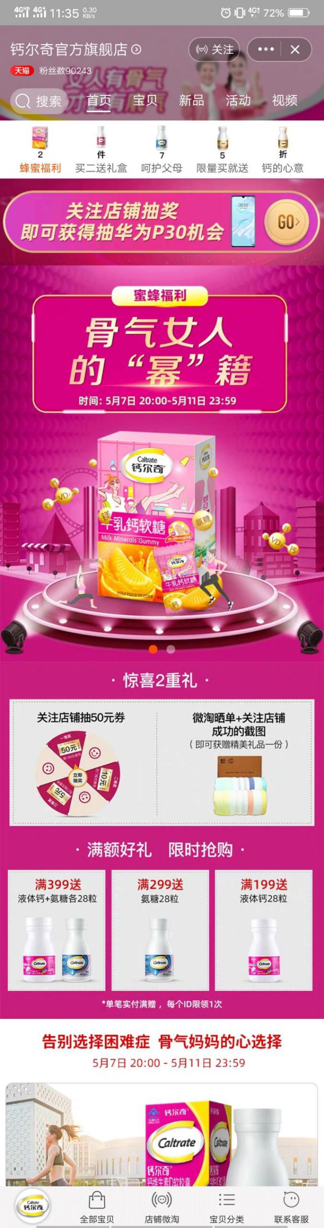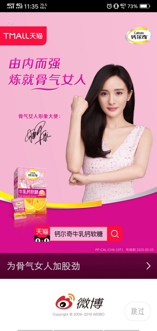 用户进入微博开屏第一眼就能看到杨幂了“由内而强,炼就骨气女人”,霸屏的广告吸引到你了吗? 点击广告跳转到钙尔奇的落地页,钙尔奇有自己的天猫官方旗舰店,所以,点击之后会直接跳转到店铺。