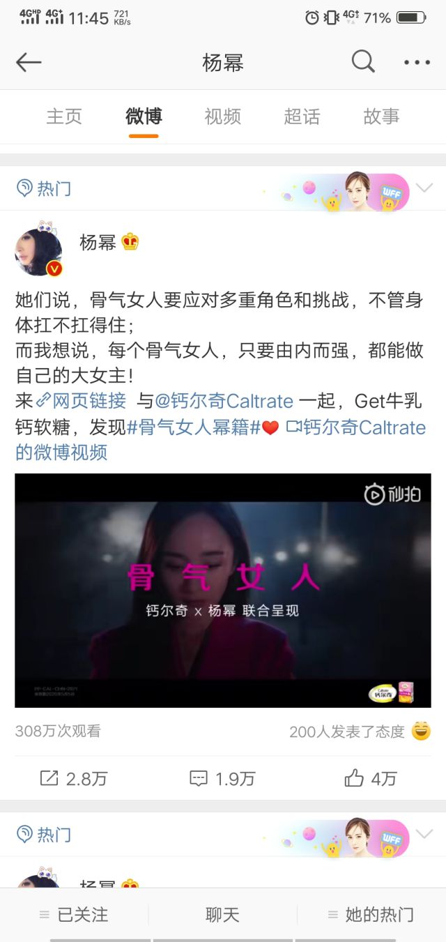 杨幂还发在微博钙尔奇广告视频,获得了1.9万的评论,4万的点赞,2.8万的的转发,308万次观看,这种推广模式直接覆盖了杨幂的粉丝群体,增强曝光,粉丝参与积极性也被调动了。 钙尔奇看中杨幂做形象大使的原因多半还是因为杨幂符合“骨气女人”的主题,投放平台选择在粉丝通同样也是相中微博的用户群体,强强联手,获得不一样的广告效果。