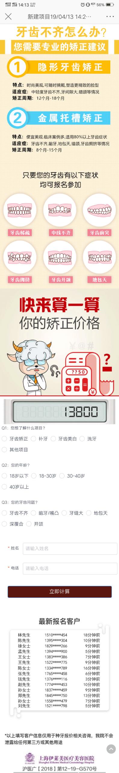 广告的文案更能吸引用户的好奇心,“文案+广告”表达出,牙套不仅款式多,而且还不贵,月薪3000都可以做矫正。文案还表达出做湖州 网站建设完矫正之后的效果,可以让女生变的更美,笑起来更迷人营销,展现不一样的魅力,月薪用对话的方式,将用户带入其中。 文案中有3个链接,链接注释文字虽然不一样,但是跳转的落地页是同一个,落地页头部先引出问题,给出解决方法,列出牙齿症状的各种症状,最营销策划方案2019后通过表单收集意向客户的基本信息,以及用户的牙齿问题年龄想要了解项目等问题,为广告主得到精准的客户信息,更好的了解客户,根据客户的情况进行后期的客户沟通实现转化。 落地页的最后还列有自信报名客户信息,暗示用户活动的真实性,并且发出声明,不会泄露资料并且不会有其他用途,让用户卸下防御心理,填写表单。