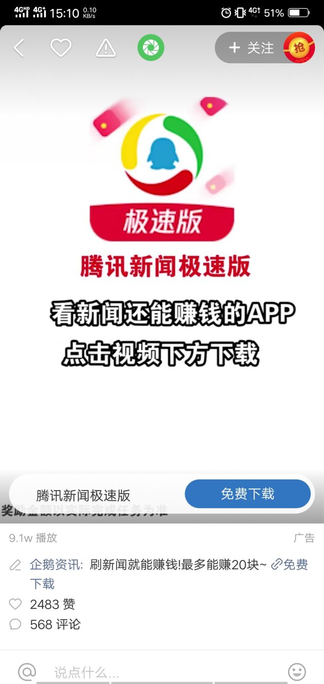 腾讯这两天闹腾的动静挺大,先是刺激战场下架,再到和平精英上架,一时间引起几亿网友的轰动,这也是一种营销手段吧,和平精英上架当天VIVO应用商店的安装量3.4亿次,频频上微博热搜。 再来说说腾讯新闻极速版,腾讯新闻极速版是为用户精心打造的比腾讯新闻精简的一款资讯阅读APP,版面排版更清晰,简约,用户使用起来浏览效果更好。此次推广腾讯新闻极速版还投放了快手广告。 广告的封面制作: 广告的封面是由几部手机不同红包的收益图片的对比做封面图,视频的封面有三部分组成:1.底图(也就是选用的封面图)2.文案3.样式,腾讯新闻极速版的视频的文案选择用钱的数字吸引用户的注意,抓住用户的眼球。 的内容通网络营销产品策划过抢红包跟刷腾讯新闻极速版的收益做对比,引导用户下载体验赚赏金。