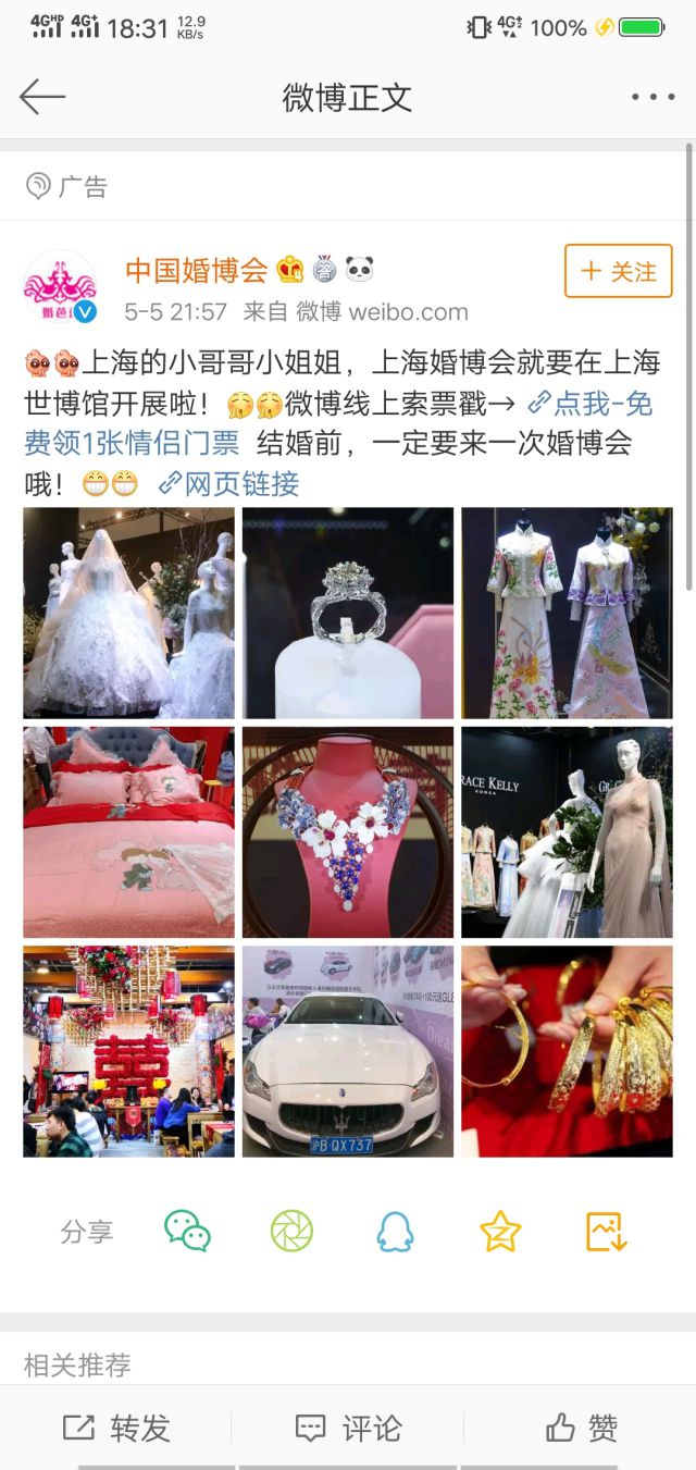 婚博会已经持续几个月投放微博广告平台电商运营了,上次的春季婚博会不知道准备结婚的小伙伴们都去看了没有,现在新一期的婚博会又开始宣传了,时间在6月1——2号世博展览馆举行,到时会有多个国家3000个国际国内高端品品牌,还有礼品送哦~ 在上海的小伙伴们可以去看看哦,可以免费领取门票,在去看之前先来了解广告案例吧。 精准的投放,触达目标群众 由广告的文案可以看出,广告采用了地域和年龄的划分,利用人群定向,可以选择用户的年龄、性别、地域等设置,进行精准投放,高效率的将广告送达给用户,不仅如此,还可以选择用户的兴趣标签进行目标人群的筛选,可以大大的提高广告的转化率。所以婚芭莎选用这种方式将广告展现给在上海的小哥哥小姐姐们。