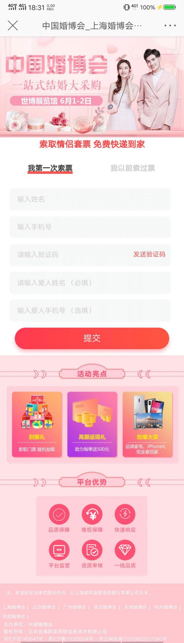 采用9宫格,多维度展示细节 广告的图片展示采用9宫格的形式,展现婚纱、礼服、婚床、收拾、婚车......结婚用的到的必需品,实现“高逼格”的展览效果,吸引用户通过文案,免费领取门票。 免费领票,增加用户积极性 婚芭莎听起来很高大上的感觉,加上“高逼格”九宫格图片,很多小伙伴肯定以为看这种展览门票一定很贵,为了打消小伙伴们的这种顾虑,文案特意表明可以免费领取1张情侣门票。“图+文”更加吸引用户,提高广告效果。 落地页表单+活动,收集客户 进入广告的落地页,就可以看到广告的活动时间,表单用来收集客危机公关级别户以及另一半的信息,同时还需要接受验证码,验证码可以过滤一部分虚假用户,直接获取精准真实的用户信息,落地页的下方还带有活动的二粮店以及平台优势,通过活动亮点来吸引更多的用户,促楚雄网站建设进转化。