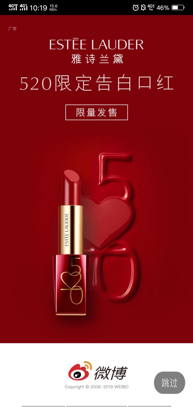 眼看5.20就要到了,又到了屯礼物的时候了,各位有没有给自己的另一半准备礼物呢?该告白的也要抓紧了,错过5.20再等一年。 母亲节刚过,各大品牌又开始了新一轮的活动预热,雅诗兰黛也为了520这一天准备了限定告白口红,在微博开屏广告准备预热,先来看看吧! 广告主的图片底色选用红色,更能体现口红的立体感展现口红的颜色,520本就是一个浪漫喜庆的节日,而红色象征着奔放、喜气、激情、热烈,在520这个浪漫的日子,用红色更能传达出节日的色彩和意义。 图片文案表达出“限定、限量发售”等信息,给用户一种紧迫心理,再加上图片的口红展示,“告白口红”成功走进用户的心理,尤其是男生,是时候买只口红去告白了,“告白口红”的名字也符合520的主题。