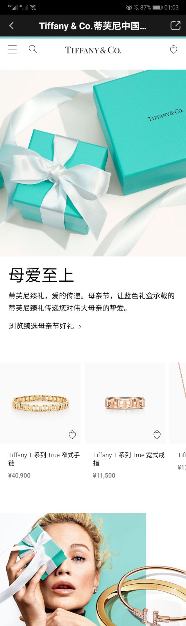点击以后,我们会进入企业官网,最终显示的页面则是蒂芙尼根据母亲节推出“母亲节好礼”合集,这样解决了现在年轻人不知道如何挑选合适的礼物送给母亲大人,而这里的蒂芙尼广告则是给大家进行推荐! (PS:这里的广告展现,也从侧面号召大家关注母亲节,另一方面,则是提醒大家母亲节到了,要多陪伴父母,给父母准备一份精心好礼等等。)