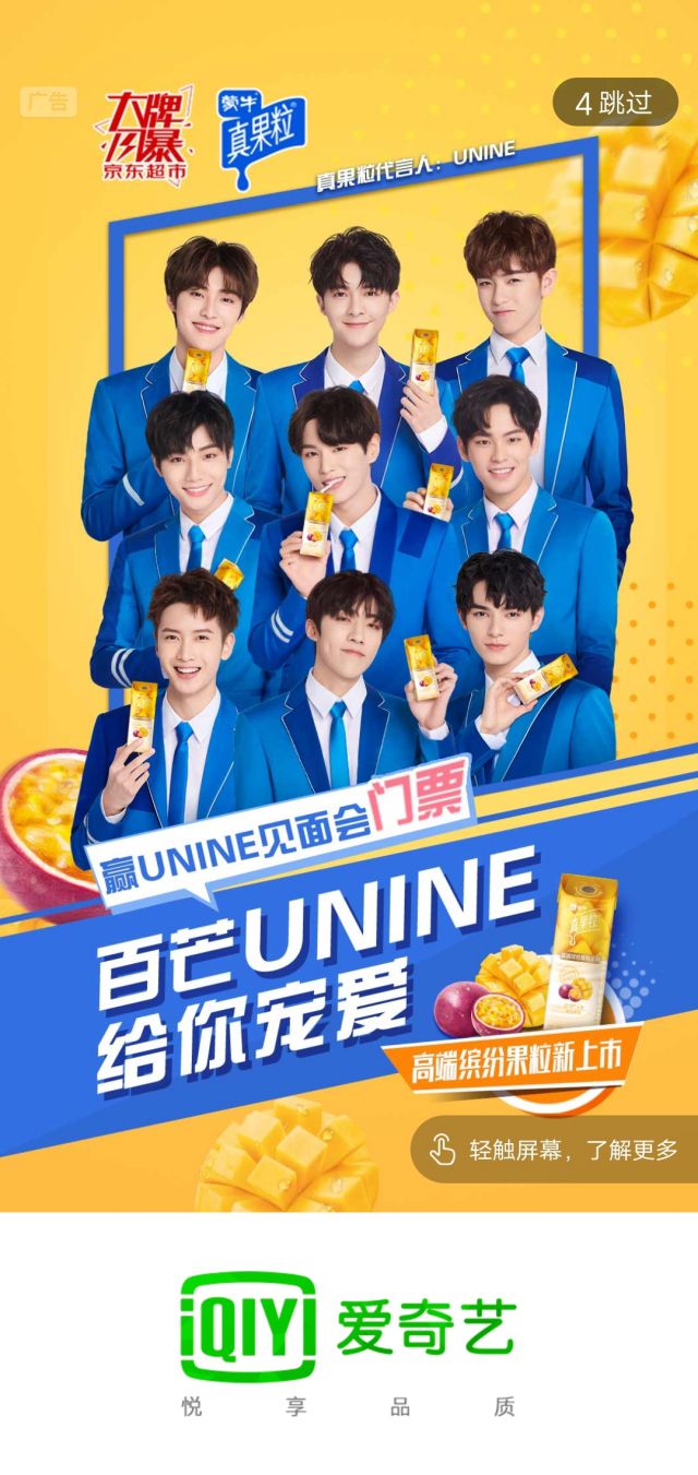 UNINE组合在今年的4月19日正式成团,在《青春有你》中,蒙牛真果粒全程赞助,不仅如此,UNINE组合成团后还成为了真果粒的新晋代言人,不得不说蒙牛真果粒真给力。真果粒在爱奇艺营销之路,抓住的不仅仅是粉丝,更是新一代年轻人的价值观。 《青春有你》虽然已经产品宣传片动画收官,但是蒙牛真果粒依然坚持投放,喏,今天还出现在,为新口味打call! UNINE组合成团第一件事就是全国巡回见面会,热度只增不减,所以,新口味为大家带来UNINE的见面会门票,只要用户去京东商城购买蒙牛真果粒,就有机会赢得UNINE的见面会门票,这无疑是丢给还沉迷在《青的软文推广平台春有你》热度粉丝们的重弹。