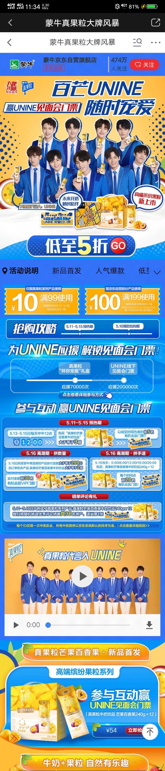 点击广告进入到广告的落地页将会跳转到蒙牛京东自营旗舰店,旗舰店里除了海报上的赢门票活动之外,还有低至5折的活动,活动说明里的活动不仅有优惠券,还有赢取见面会门票的方法规则以危机公关案例淘宝事件的影及时间等信息,如果仔细阅读活动规则不难发现,真果粒此次活动的目的主要是增加新品的销量,几乎每一种的中奖方式都跟新品有关联。 落地页的最下方就是真果粒代言人UNINE录制的视频了,真真真真是为真果粒实力打call!
