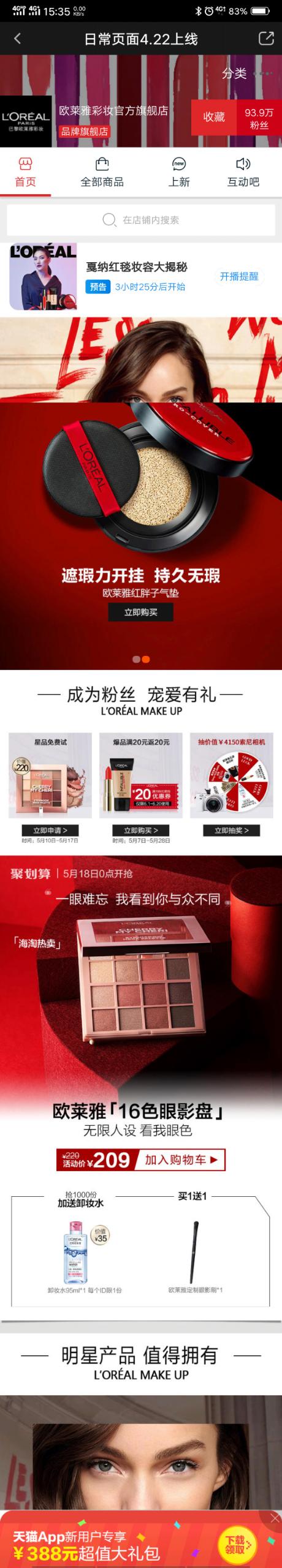 每一位来自巴黎欧莱雅明星梦之队的成员,都将通过2019戛纳红毯和全新升级的欧莱雅值得说,与品牌一起回溯22年的电影节历史,向每一种电影艺术与美致敬。 这应该是今年最牛,阵容最大的品牌营销了吧! 点击广告进入落地页,直接跳转到欧莱雅的天猫商城,最显眼的就是戛纳红毯妆容大揭秘的直播了吧,其次是各种优惠信息,只要你买,欧莱雅就送礼品,礼品有卸妆水、订制眼影刷等,看来巴黎欧莱雅这次是要接着戛纳电影节大干一场了!