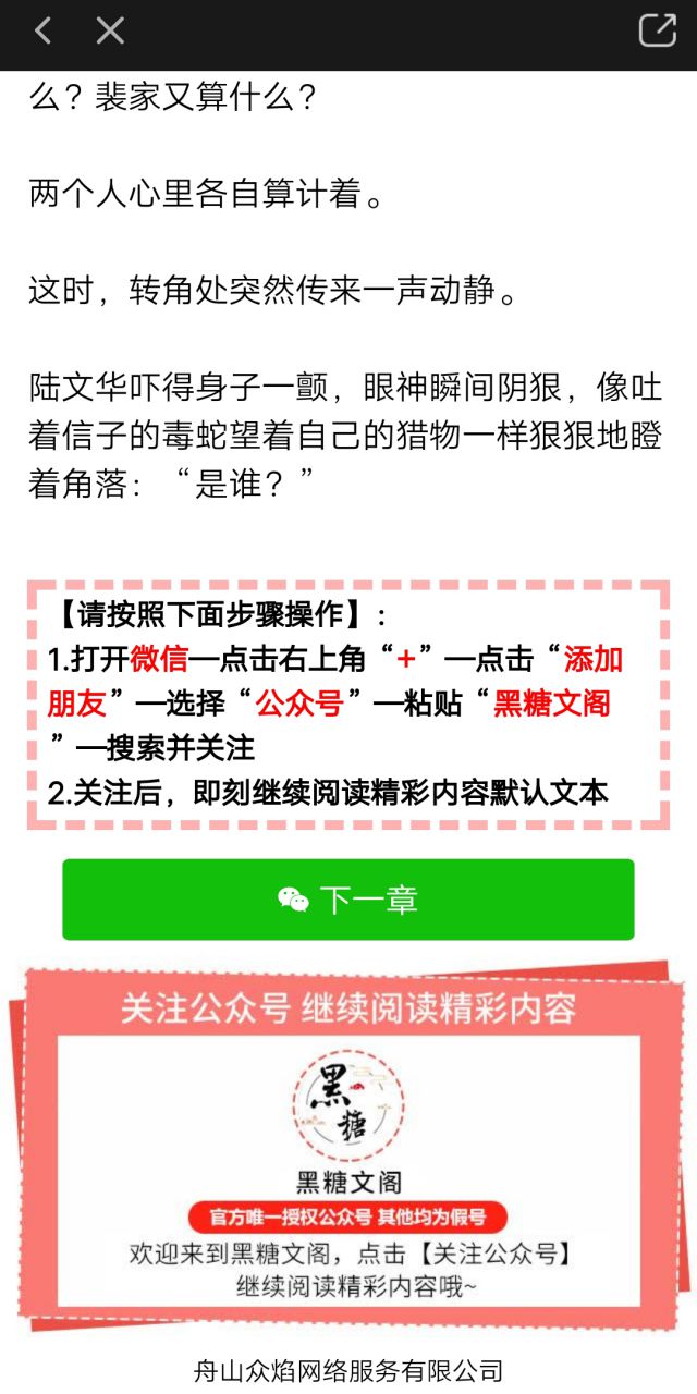 广告的落地页供用户免费读到第三章,第三章到最精彩的部分会有“下一章” 按钮,用户只用点击“下一章”就会自动复制微信公众号,通过爱奇艺跳转到微信,用户只需要将复制的微信公众号粘贴,搜索后选择关注就可以继续阅读了,对于不会操作的用户,落地页有教程,用户可以根据教程完成添加。 最近小编在分享案例的时候发现推广小说的广告主由两种类型:第一种是微信公众号类型的广告主,第二种是APP类型的广告主,如推广的追书神器免费版。