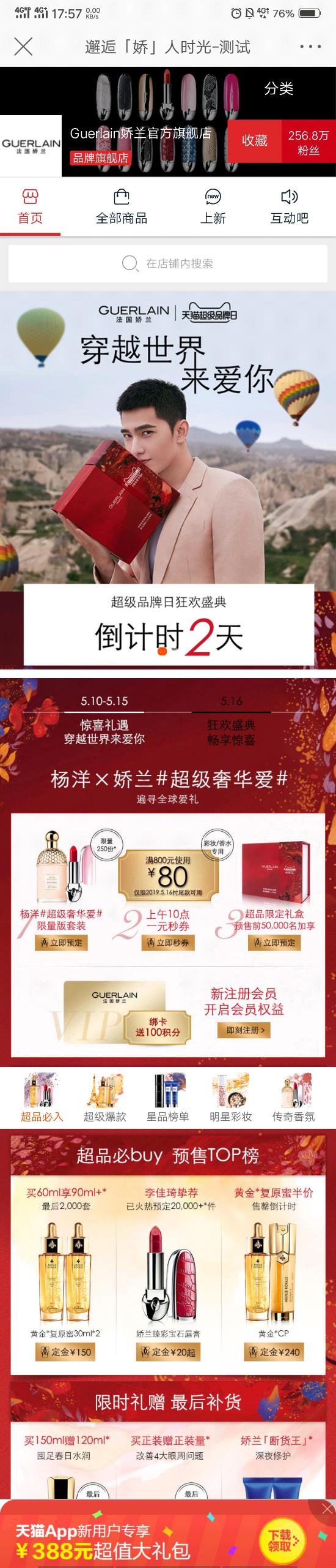 点击视频右下方购买链接,就可以跳转到广告的落地页了,落地页部分直接跳转到娇兰的天猫官方旗舰店,看杨洋是如何“穿越世界来爱你”的,粉丝们可千万不要被迷晕喽。 店铺的首页不仅有杨洋,还要一些优惠信息和一些限定款,如:积分卡、满送活动、限量套装等,给用户一种紧迫心理。 现在想要购买产品可以先预付定金喽,如果用户想要购买的话,但是又怕抢不到,就可以通过付定金的方式开始预订。 距离法国娇兰的超级品牌日狂欢盛典还有两天,你做好准备了吗?