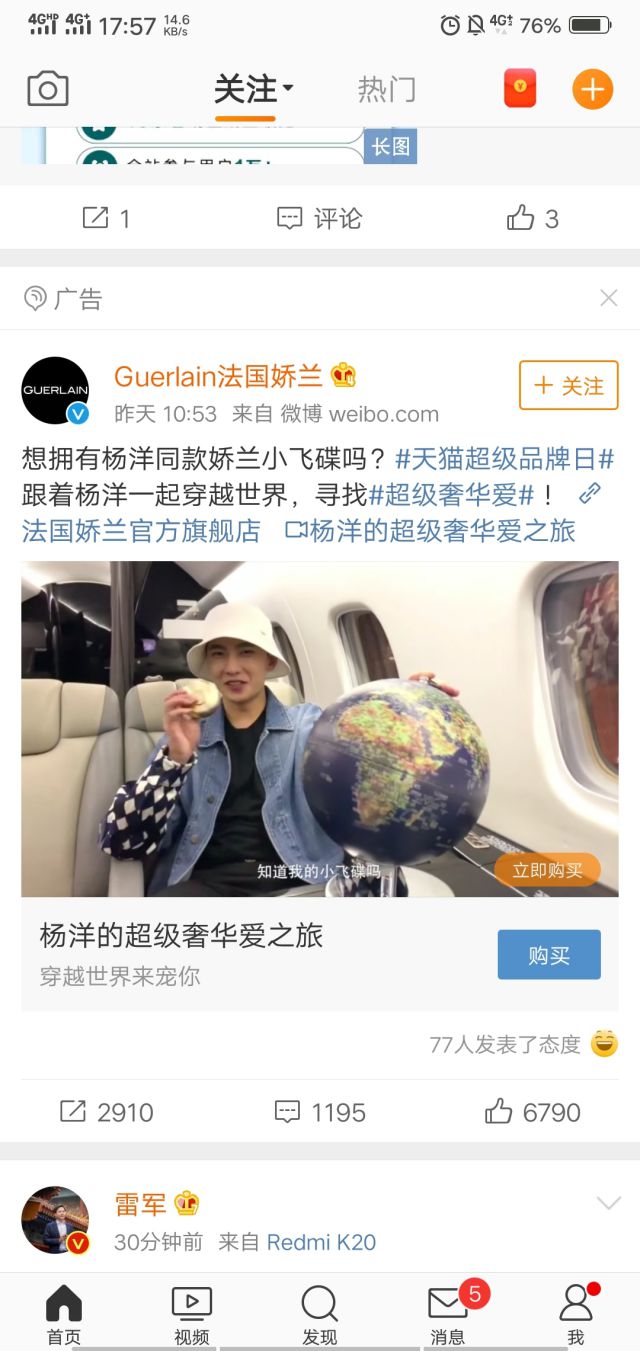 法国娇兰的代言人去年还是有连个,范冰冰和杨洋,但是自从范冰冰事件之后,再也没见法国娇兰和范冰冰有什么互动了,今天法国娇兰又在微博投放广告和杨洋互动,这一波广告用上明星效应是算还是算借势营销? 先不管这些,还是先看看广告案例吧。 广告的外层文案借助杨洋引发粉丝效果,视频用的也是杨洋的个人视频,对粉丝们来说也是极致诱惑。
