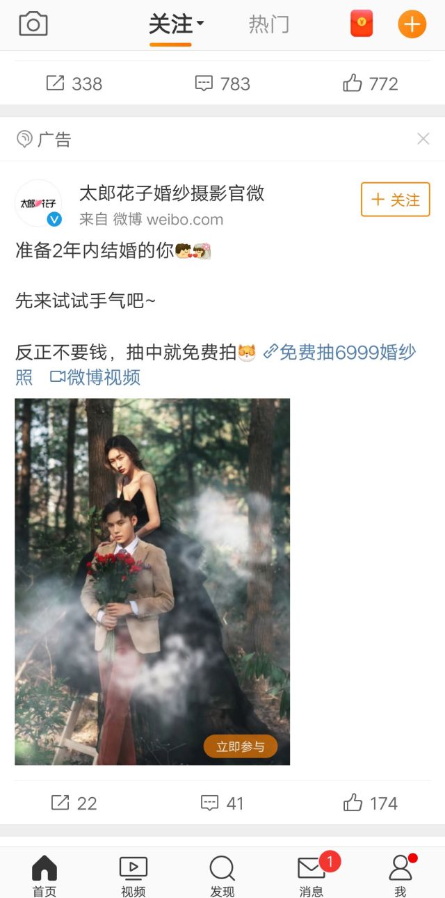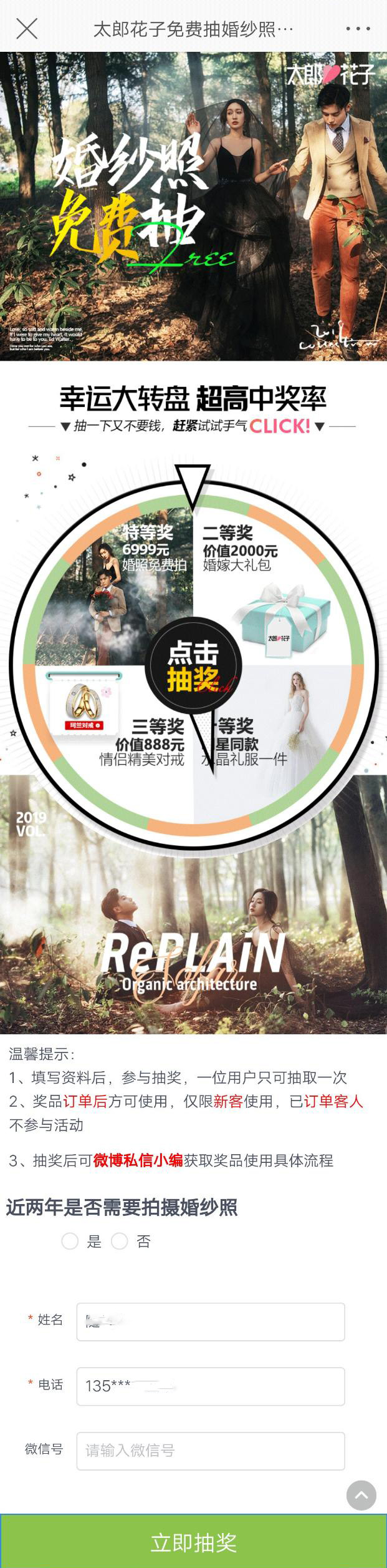 太郎花子也是一个有十几年的老店了,经历十几年的5网站建设成长也已经算的上是本地婚纱摄影行业规模大的品牌之一,但是随着现在的经济发展,年轻人对婚纱照的要求也是越来越高,创业宣传海报婚纱摄影行业竞争激烈,获获客率也在逐渐下降,如果再不采取些措施迟早会被市场淘汰。 太郎花子为了提高品牌的曝光量、客资量、扩大品牌的影响力,最终实现转化率,在微博投放了信息流广告。 广告的外层文案抓住用户心理,试试手气,反正不际恒公关要钱,抽中就免费拍,很多用户对这种形式的广告都非常感兴趣,既没什么损失手气好了还可以拍婚纱照。