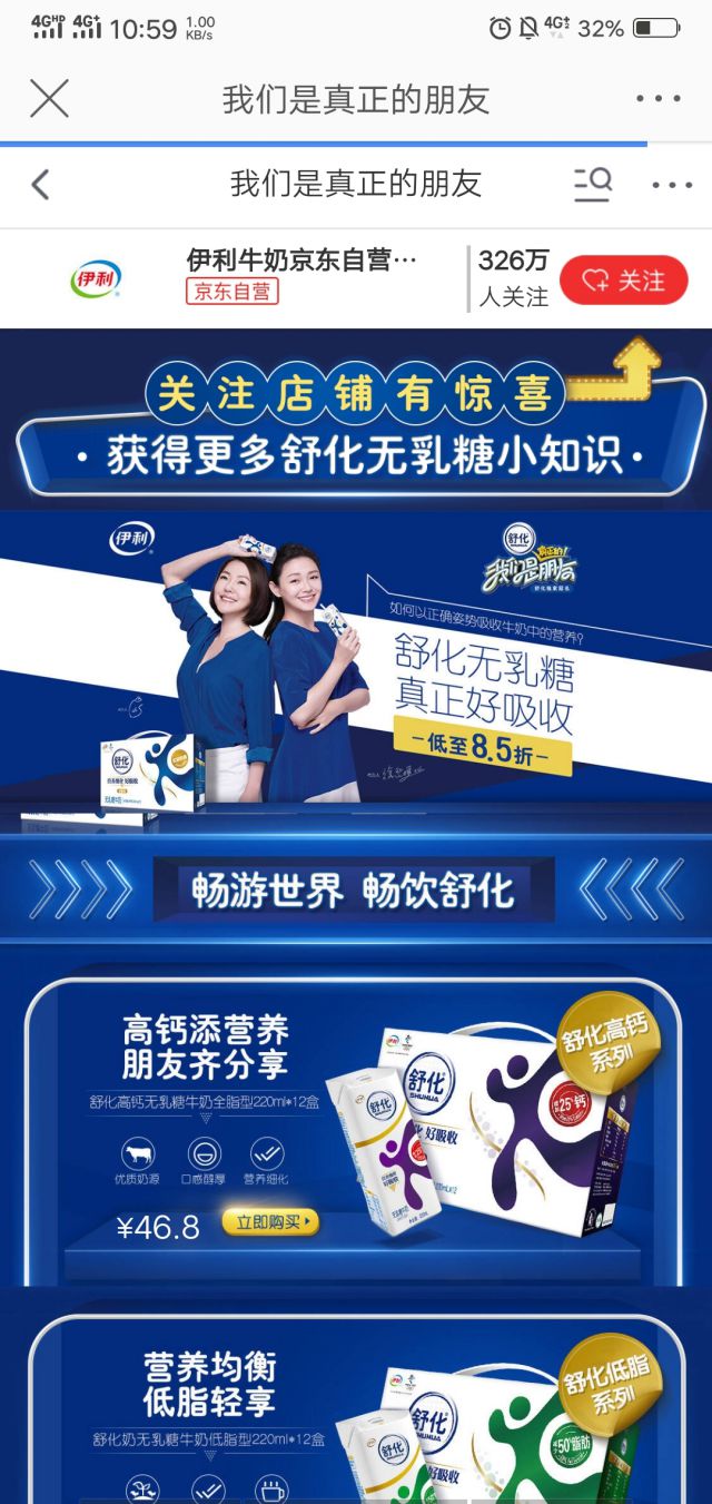 广告文案配以视频,pi滴滴危机公关ck用户,但是用户想要pick大小S的同款奶就需要点击落地页啦! 落地页跳转至京东商城伊利舒化奶的首页,首页更是有活动信息喽,低至8.5折,每一种口味的舒化奶都有明码标价,多种产品供用户选择,除了有舒化奶的多种口味产品,还有伊利品牌的其他产品,例如:安慕希、金典、畅意、谷粒多、味可滋,还有儿童牛奶产品供用户选择。 这样一来,广告不仅带动了伊利舒化奶的销量还带动了其他产品的销量,果然只有套路的人心啊。