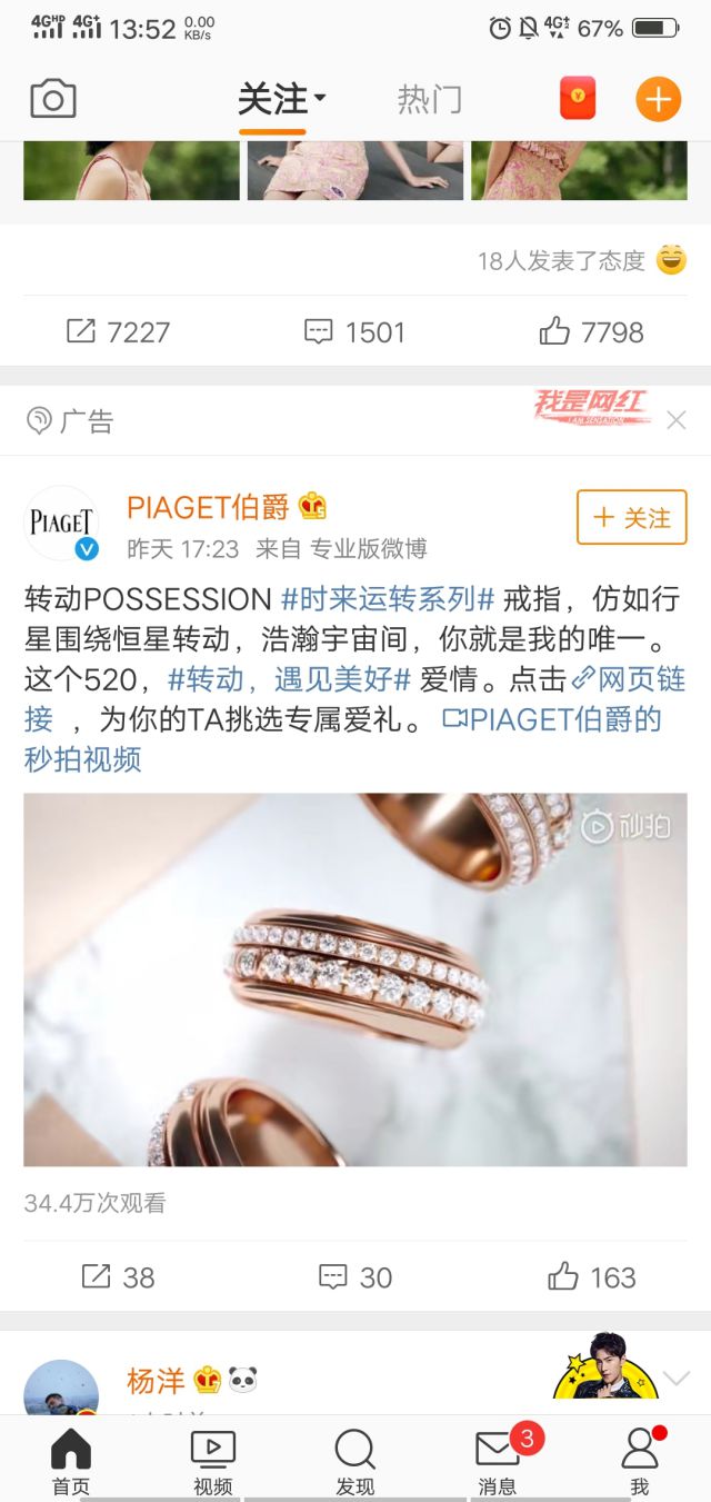 伯爵是来自瑞士的星巴克歧视黑人危机公关分高端腕表珠宝制造商,520就要到了,伯爵推出时来运转系列戒指,仿如行星围绕恒星转动,浩瀚宇宙间,你就是我的唯一,所以这个520你想好送给TA什么礼物最好了吗? 伯爵时来运转戒指推出,投放了微博广告,文案阐述戒指的意义,秒拍视频展现戒指的款式,不得不说看起来很吸引人,很心动。