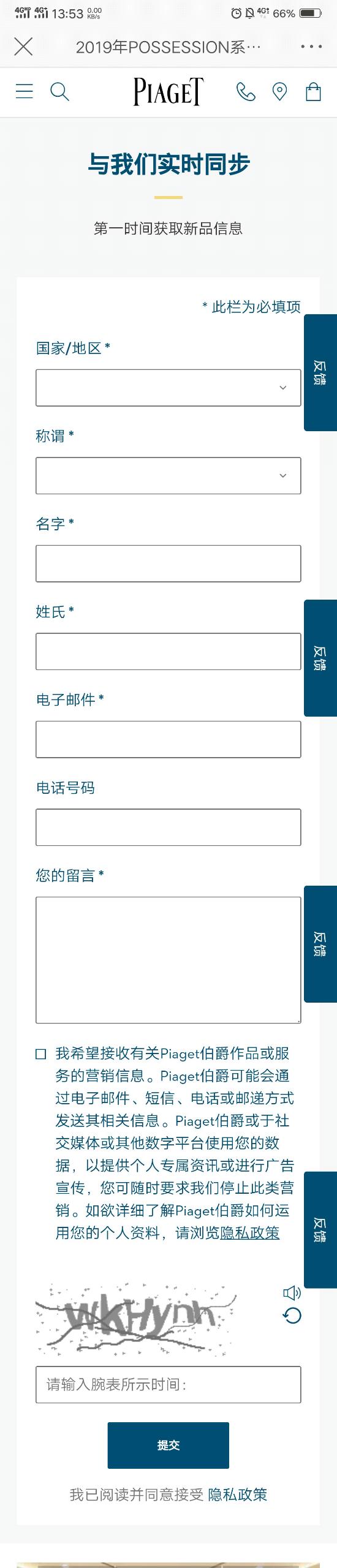 点击进入落地页,跳转到伯爵的商城,胡歌在商城里等你,看完时来运转的几种款式之后只能眼馋,几种不同的款式有不同的价格,在往下看就是表单了,如果用户有心仪的款式可以选择填写表单信息,不得不说表单有一大缺点。