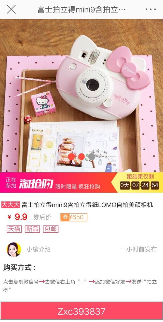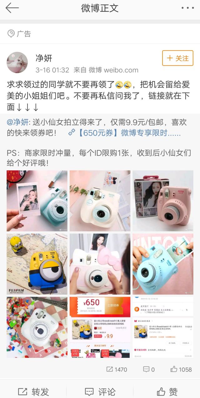 说到“卖点”,那么淘宝客的卖点是什么呢?当然是高额优惠券了,用户都有一种求廉心理,所谓“货比三家”,同样的商品,哪家便宜买哪家的东西,哪怕差距几毛钱也是这样,尤其是在网上,用户的求廉心理更强,尤其是学生党,学生党经济有限,如果买贵点的东西那一个月的生活问题就不好解决了,所以,做淘宝客的推广要抓住这种心理才会有好的转化。 而广告主投放的广告素材,文案中用激将法给用户一种紧迫的心理,而且让用户联想到好像是有很多人在抢购。 图片用九宫格的形式展示拍立得的细节以及650元的高额优惠券,最后付款价是9.9元,了解过拍立得的小姐姐会了解到淘宝上的买一个拍立得要300元左右,在这里买只要9.9元,配图的最后一张还配有用户下单的截图,这无疑推广整合营销是给爱美的小姐姐们打了一剂“鸡血”。