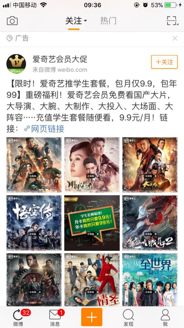 广告主的广告博文直接指出这次广告的重点是要推出爱奇艺的学生套餐,学生开通爱奇艺会员以后,就可以享受包月9.9元起,包年99元起,跟上面的正规价格相当于折了一半。也可见爱奇艺会员对于此次推广活动的优惠力度之大! 在突出价格优势之外,广告主又来跟大家表明开通爱奇艺会员的好处,比如免费观看国产大片等等,在这一层面上,广告配图有很重要的作用!广告配图就是当时阶段最热门的电影! 如果用户想要全部免费观看更多电影就可以开通会员进行电影观看! 由于此次的活动是针对学生的,所以我们的在微博粉丝通广告后台也可以对目标受众的年龄、职业以及用户兴趣爱好进行基础设置,让更多有需要开通爱奇艺会员的用户关注我们的广告内容! 以上的内容就是爱奇艺会员大促投放的微博粉丝通广告案例啦!这个案例也告诉我们这么一个道理: 我们在做活动推广时,可以根据不同层级的用户来设计不一样的广告文案、广告活动会比一场活动针对所有用户来的效果要好。不同层级的用户对于活动内容有不同的关注点,所以我哦们尽可能根据不同层级用户的关注点来做广告创意设计才能够让目标用户为我们的推广内容买单!
