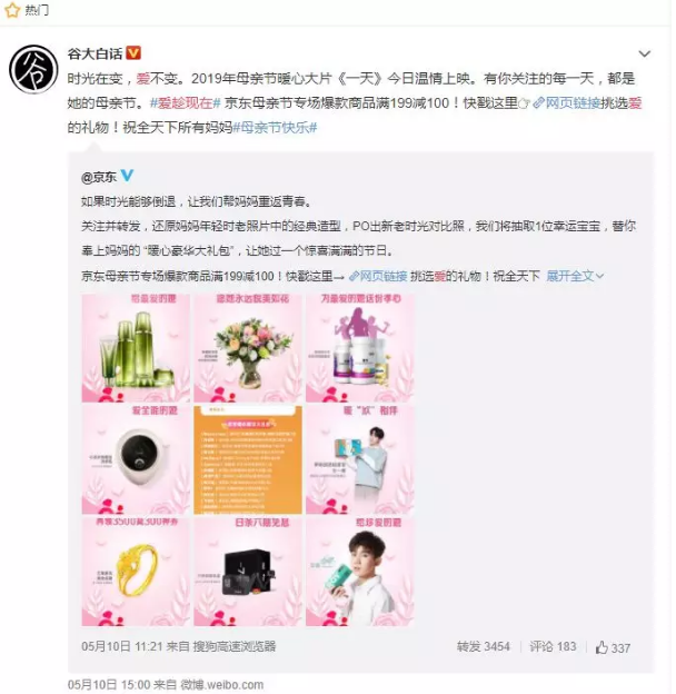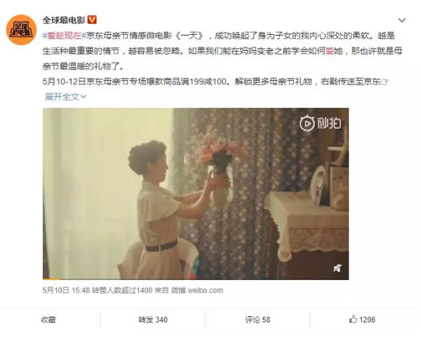 2.千万级曝光量,引发用户走心情感互动 《一天》精良的广告内容,助力京东在母亲节大节点中斩获不小的品牌声量。京东顺势在线上发起#爱趁现在#的话题,并直接成为首个承包微博#母亲节快乐#话题标签的品牌。