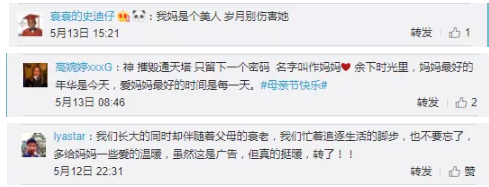 最关键的是,借助社交平台渠道的互动优势,大量深受感动的网友纷纷倾吐心声,无形中为京东积累下良好的口碑,也印证了京东在母亲节精准把握到了大众的情绪点。