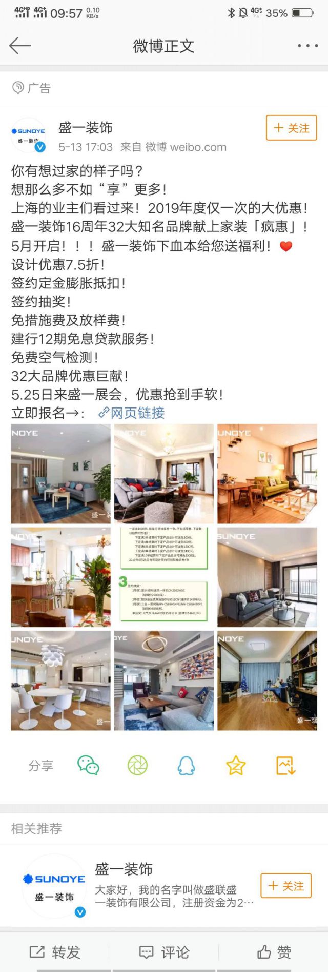 我们为什么要装修? 还你一个家才是装修的终极意义。 每天在早出晚归的我们,为了胜过奋斗着,工作这么辛苦回到家在看到破破烂烂的样子,心里不会得到半点安慰,反而日子越过越累,为什么要装修房子,因为我们需要一个真正完整的家,一个在我们累的时候可以放松的地方,但是装修房子也不是一笔小数目,对于大众的求廉心理盛一装饰投放了周年庆的活动广告。 广告主选择的广告平台是广告,微博可以帮助广告主让广告曝光度更高。 广告的文案开头用疑问的方式吸引用户好奇,后又推出一系列的装修优惠活动,盛一装饰广告主16周年店庆活动7.5折,文案将僵尸用到的家装品牌说明到具体数字供用户选择,并且选择装修之后定金也有抵扣。免费为用户做空气检测支持免息贷款,这样的活动湖南邀请媒体无论是对目前手头松和手头紧的用户都能照顾的到。