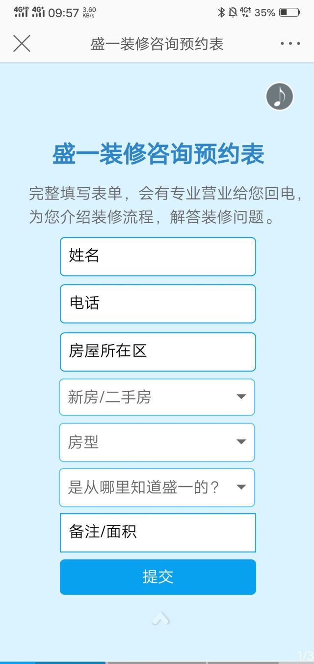 配图选用九宫格的形式,将各种装修风格用九宫格呈现给用户的眼前,总有一款可以吸引到用户。 点击文案中的报名链接就跳转到广告的落地页了,落地页用的是H5样式,H5的第一推动新闻发布页中有表单,帮助广告主获取意向客户的基本信息,用户填写完表单提交之后广告的后台都会做出统计,方便广告主对用户的转化。第二页则是上海地区的用户如果想去盛艺装饰公司详谈的公司周边以及路线。第三页的内容就是公司的logo了。