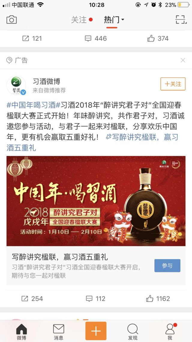 广告主推广的案例是就是推广【习酒2018“醉讲究君子对”全国迎春楹联】的活动,而在广告主投放以后,获得了更多活动报告内容! 广告主在发布广告博文时,有添加#中国年喝习酒#的话题,而这一话题的内容可以让更多的用户关注我们的广告内容。 在博文下方,还有话题,用户点击以后就可以进入话题,在话题中也可以分享相关内容! 说完之前的广告案例,我们来说说2019年的微博粉丝通广告的酒类广告推广类型有哪游戏危机公关些? 1.推广酒类新品 通过广告内容描述,最新的酒类产品; 2.推广酒类活动 通过广告文案的位置来说活动主题、参与流程的描述; 3.品牌宣传 通过官方广告位,来宣传企业形象! 我们在2019年的时候投放微博粉丝通广告,可以进行,通过微博粉丝通开屏广告、信息流广告、热搜榜同时进行,让广告内容通过不同的形式进行展现,也可以让用户对我们产生更多的关注!