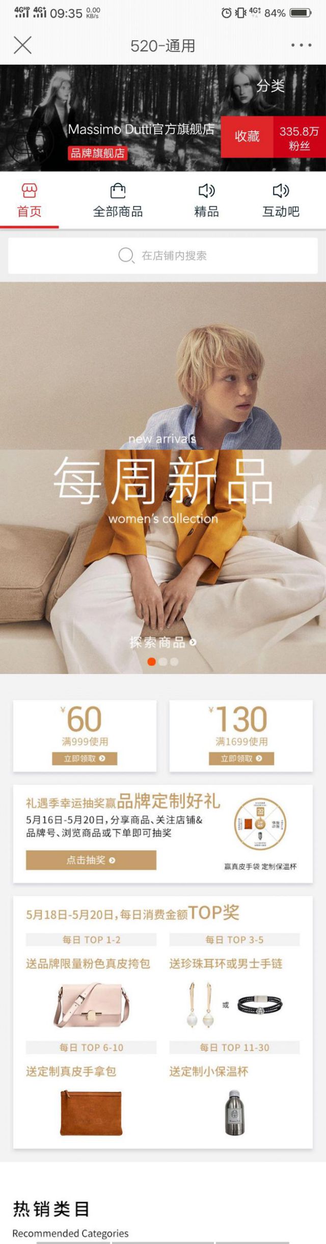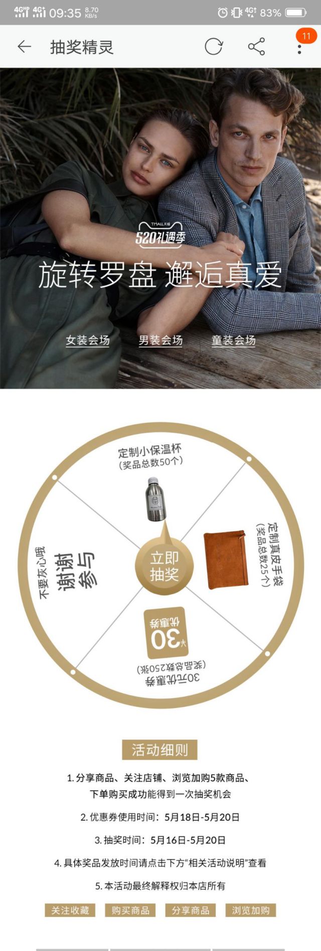 广告的配图用礼遇季的海报图以及Massimo Dutti天猫官方旗舰店的优惠信息截图,吸引用户兴趣,进入店铺了解详情。 进入落地页之后就跳转到天猫官方旗舰店了,用户可以参与活动转动转盘,但是在转动转盘的时候需要用户填写旺旺名,也就是淘宝名字才能进行抽奖,填写旺旺名字有利于广告主收集意向客户信息,进行客户追踪实现转化,同时还可以帮助广告主做人群分析,以及对优化师优化广告提供帮助。