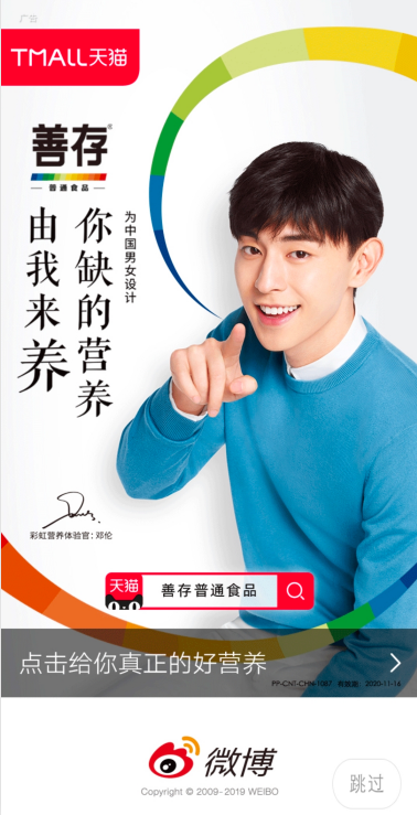 善存是多维元素片,主要用于预防和治疗因维生素与矿物质缺乏所引起的各种疾病,相信有很多用户用过这个品牌的产品,今天出现在微博开屏广告上,先看广告案例。 在用户点开微博的时候第一眼就可以看到邓伦,没错,邓伦是善存的彩虹营养体验官,善存是为中国男女设计,图片中有种被邓伦撩的感觉因为在邓伦的旁边是:“你缺的营养由我来养”,相信邓伦的粉丝已经按奈不住了。