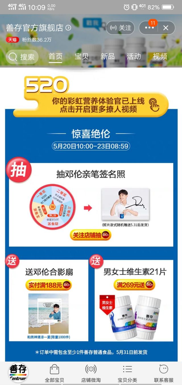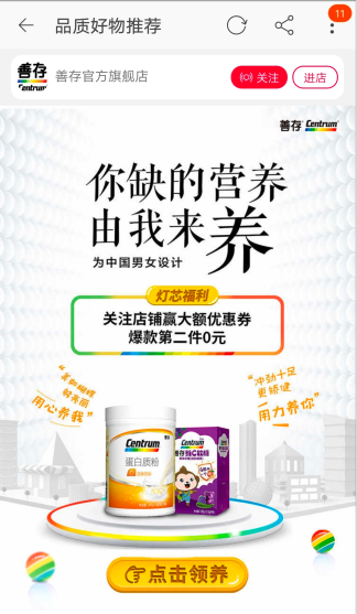 点击广告进入落地页,落地页展示优惠信息,不仅可以领取优惠券爆款的第二件0元,点击落地页中的&ld电商营运吧quo;点击领养”之后,跳转到善存官方旗舰店的天猫店铺的首页,进入到首页最关注的是店铺内的营销推广网站方案优惠信息,抽邓伦的亲笔签名照还有买送的优惠活动,这写优惠信息应该是广告主特意为邓伦的粉丝量身定做的吧,明星效应引发的粉丝行为。