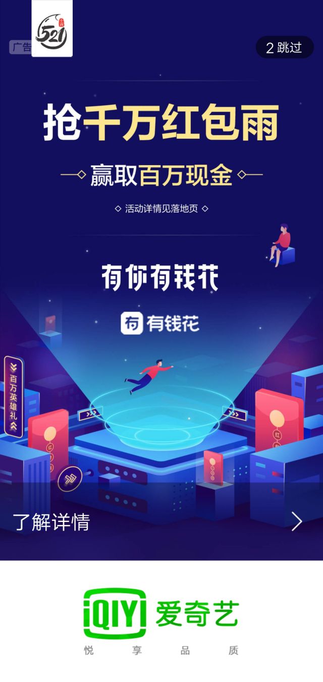 月光族的痛点是什么,知道吗?就是没钱花,月初买买买,月末吃吃土,钱总是不够花,找朋友借钱不靠谱,不如自己想办法,有钱花APP就是这样诞生的吧。 有钱花今日份的爱奇艺开屏广告了解一下。 广告大图展现,图片上的字体放大,通过千万红包雨来吸引用户,还能赢取百万现金,除了红包引导用户点击,图片中还特意有文字引导用户点击的文字“活动详情见落地页”。