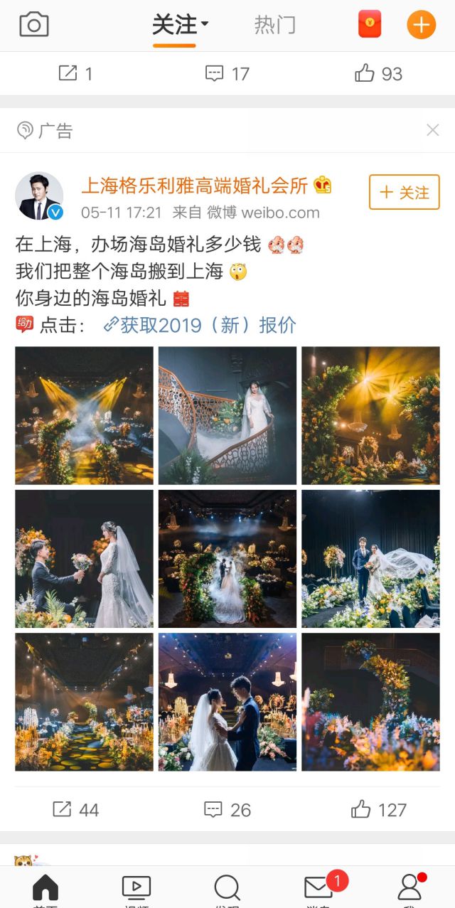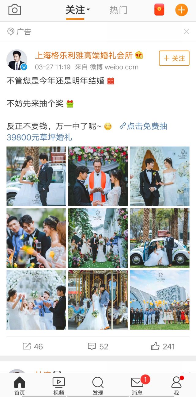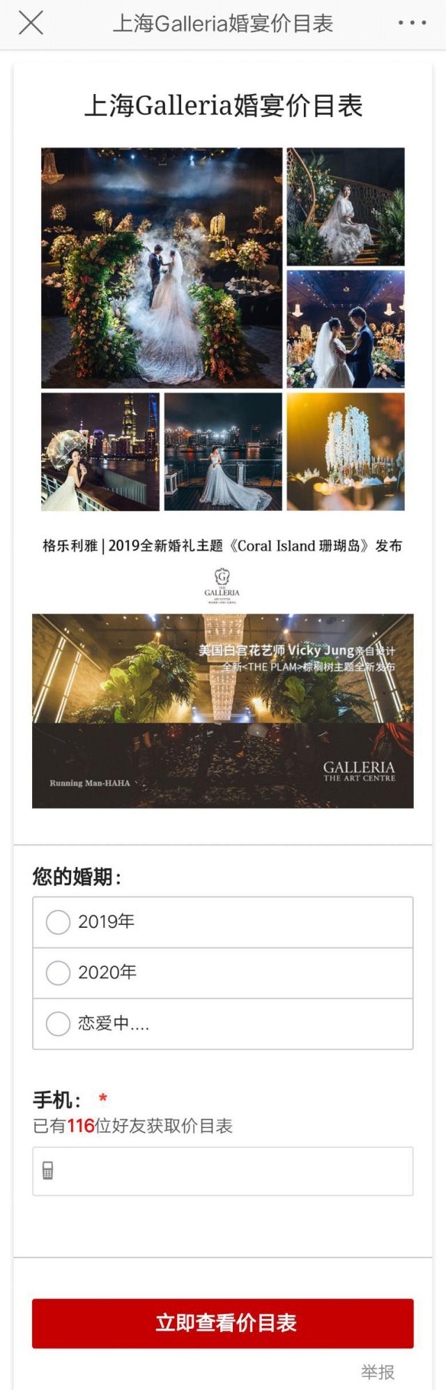 每个女生都有一个公主梦,小时候看白雪公主和七个小矮人使女生对通话世界有了强烈的憧憬,如今最后一批90后都已经成年,所以现在的适婚年龄主要落在了80、90后的身上。而每个女生都奢求有一场盛大的婚礼,毕竟婚礼这辈子也只有一次,如果婚礼能像施了魔法一样美丽就好了。 没关系,这些公主梦上海格乐利雅高端婚礼会所都可以满足你,可以帮你办一场真的带有“魔法”的婚礼。不要问小编是怎么知道的,虽然小编作为90后的中间一波,但是毕竟小编还没有结婚,收到这样的广告进来了解一下也是理所应当,先来看广告主投放的微博的广告案例吧。 首先,小编收到的广告样式有两种,第一种是针对有目标准备办婚礼的,想要了解报价的用户,第二种是没有目的不确定什么时候结婚的用户群体。 第一种广告:文案主要是针对喜欢海岛式婚礼场景的用户,文案中留下悬念,吸引用户点击文案中的链接进入落地页,再加上广告的配图选用九宫格的而方式,用九张图片向用户展示海岛婚礼场景的各个细节,让用户第一眼就感觉到了唯美、高端、大气,吸引用户点击广告进入落地页。 落地页中的图片依然是采用婚礼场景的图片,还有一张设计出处的图片,吸引用户沉淀用户,下面是收集用户信息的表单,主要是收集用户的婚期以及手机号,为避免用户对填写手机号有猜疑的心理,所以广告主在手机的下方用红色比较显眼容易引起用户的颜色限时已留取手机号的好友数字获取价目表,消除用户的犹豫,收集已经有结婚目的的用户的信息。