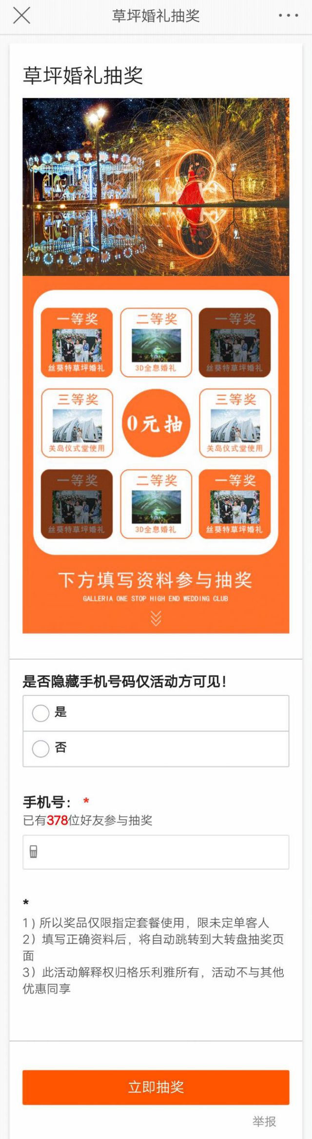 第二种样式:文案主要针对近两年结婚的用户,文案用抽奖的方式,并且用数字写明抽取的婚礼价值,吸引用户,图片采用草坪婚礼的图片,依然采用九宫格的图片样式各个细节多维度的展现婚礼场景,吸引用户点击。 进入落地页之后就是抽奖页面了,抽奖的奖品没有空降,而且是0元抽奖,增加用户兴趣,奖品有多诱人广告主的套路就有多深,用户想要参与抽奖需要填写手机号,但是为了用户的隐私着想,广告主特意设置了让用户选择是否隐藏收集号码,用户选择仅活动方可见,这样一来直接消除用户的猜疑心理,无后顾之忧的填写手机号码,同时,广告主在手机号的下方用红色字体显示已有多少位好友参与抽奖,增加用户的积极性。