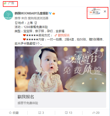 宝爸宝妈们,在拍摄儿童摄影时,也会考虑摄影价格、隐形消费的问题,所以在这里韩国MOONBABY儿童摄影的微博粉丝通广告还是比较直接的,直接告诉用户此次优惠活动的参与条件、活动价格和摄影类型等内容! 我们看到广告主投放的微博粉丝通广告以后,我们可以获得以下信息: 1.广告主是韩国MOONBABY儿童摄影,广告主能够为上海地区的用户,提供价值1288元套餐免费体验产品营销策划公司服务。并且可进行体验的摄影类型为宝宝照、亲子照、孕妇、全家福。 2.如果广告主对广告内容感兴趣可以点击链接进行咨询,也可通过点击“戳我报名”参与此次活动,参与活动以后,还能够和企业进行一对一对话、沟通! 3.在这则广告内容中,广告主还向用户表明自己的能够提供的实际服务,比如一对一拍摄、2服4造、拍50张、赠5张精修、实木伊卡璐桌框等等。 无论是儿童摄影还是婚纱摄影,我们的广告内容都应该尽可能简单、快捷的给用户呈现企业能够提供产品宣传视频制作的优质服务,这样用户想要知道的内容都能够从广告内容中进行了解,并且广告内容中提供用户想要了解的内容,也会减少有用户的思考时间,并立即进行冲动消费等等!