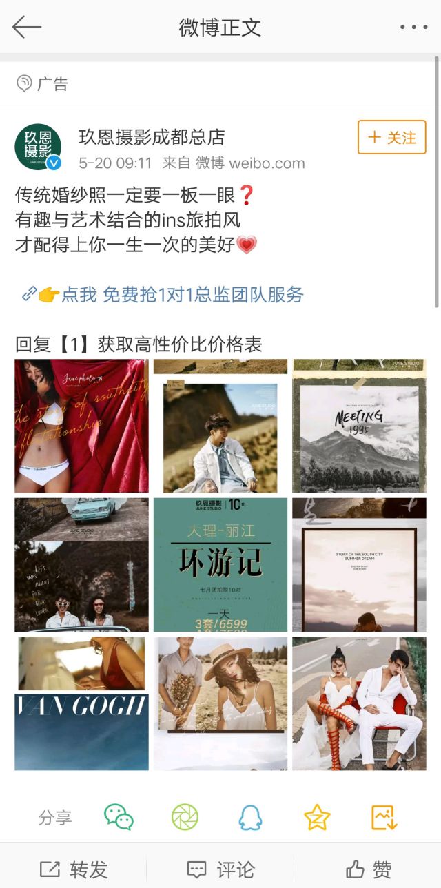 婚纱摄影行业目前是互联网广告行业的重点发力的行业,正是因为婚纱行业现在炙手可热备受关注,所以同行的行业压力也越来越激烈,无论是线上好事线下,获客成本都非常的高,利润空间也在被推广成本不断的压缩,以前信息流广告还没兴起的时候,广告主都是利用法穿范等方式传播,相对来说成本非常高,但是现在有了信息流广告,做引流是怎么样的广成本相对较低,利润空间也能得到一些提升。 先看一只来自微博的婚纱摄影的广告,广告主是玖恩摄影。 广告文案使用对比的方式,将传统婚纱照和“有趣”的婚纱照做对比,突出广告主想要表达的主题,同时吸引用户,沉淀用户。并且引导用户在广告下方留言评论。