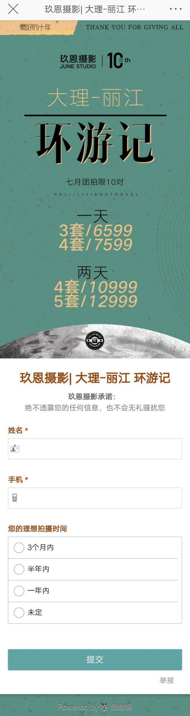 广告的文案使用九宫格的图片样式,展现不一样的有趣的艺术的ins旅拍风,吸引用户的兴趣。 在文案中,只用点击文案中的链接,就可以抢免费的今日头条开户标准1对1总监服务,总监服务给用户一种技术过硬值得信赖的心理感觉,并且是1对1服务,更增加用户的积极性。 进入到广告的落地页,可以看到拍婚纱照的价格问题,以及拍照去的地点,仅限10对,再往下则是表单为广告主收取高意向用户客资的信息。