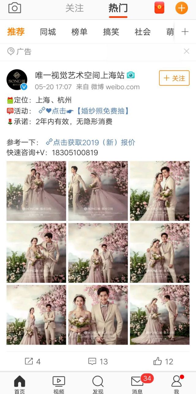 在女生的眼里,认为美丽的婚纱是圣洁的象征,更是爱情的见证,所以拍一套心意的婚纱在女生的眼里已是必需品,除此之外有的用户有一种虚荣心理,在婚纱照上也要和周围的朋友攀比,总之,无论是出于什么样的心理对婚纱照有所追求,最后唯一相同的部分就是都不想错过吧。 唯一视觉是上海最早的摄影工作室之一,随着公司十几年的发展得到越来越多的客户认可和信赖,尽管如此,唯一视觉依然在坚持投放微博广告,希望微博上带来更多新客和更高的转化率。 广告的文案简单明了,直接列出定位地点以及活动信息和唯一视觉对用户的承诺,而活动信息“婚纱照免费抽”不仅可以可以投稿的新闻网站吸引意向用户的参与还可以吸引潜在用户,因为活动的地点是上海、杭州两大地区,所以广告投放的时候要选择用定向投放,一次来挖掘更多的精准潜在客户。