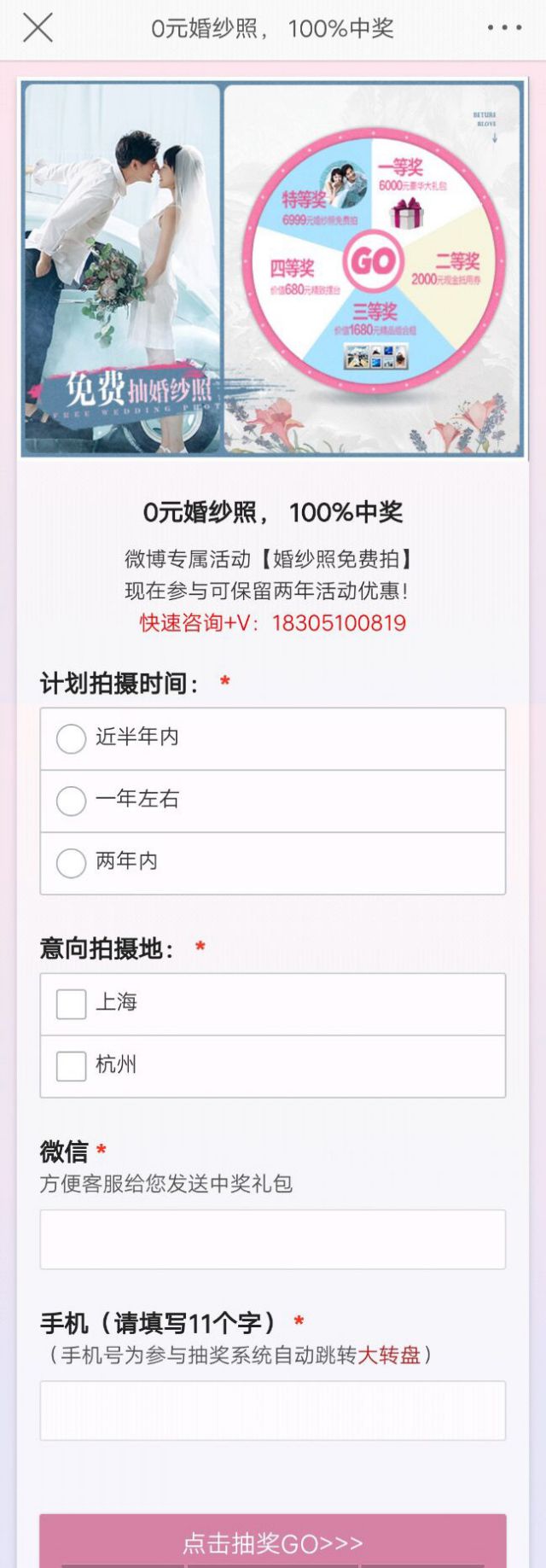 而文案中不仅有一处的优惠信息,还有获取最新婚纱照报价,双重诱惑,吸引目标用户的点击。 落地也设计的第一屏设计很重要,要结合广告主题,因为落地页是收集客资最关键的一步,所以尽量第一幕出现的是用户想要看到的,然后一步一步引导用户往下继续参与,如果进入到落地页的第一眼就看到一些乱七八糟的东西会影响用户的体验感,接着有一种被忽悠的感觉,这样不仅收集到的客资寥寥无几,还会对品牌造成一定的伤害。 而唯一视觉的落地页是用户抽奖的转盘,并且100%中奖,而且现在抽奖还可以保留两年的优惠,也就是说,用户只要近两年拍婚纱照都可以用,这一条件当真是吸引用户让用户毫无顾虑的填写表单参与抽奖。