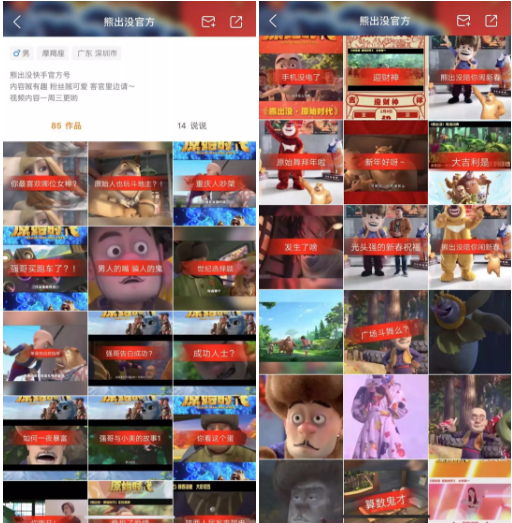 方特动漫在快手上开设了名为“熊出没官方”的账号。团队配置了专门的策划运营人员,每周发布2-3个视频,结合短视频平台的“热歌”、“热词”、“地方化配音”等流行因素,传播品牌“健康快乐”的理念。轻松有趣的内容吸引了近50万粉丝,单个视频最高点击量达到235万次。短对影视作品的助力可见一斑。