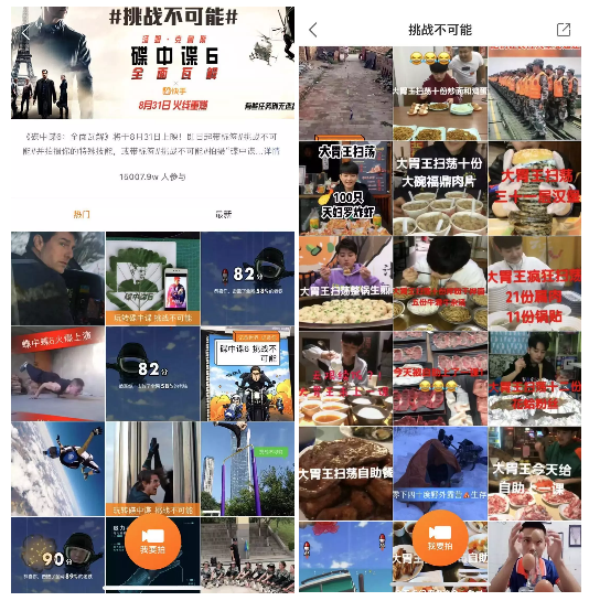 2、短视频成影视营销新标配 不仅是《熊出没》系列电影,短视频已经成为影视营销的标配。《碟中谍6》上映之前,品牌方选择了快手平台作为影视宣发的重要渠道。在快手上,品牌方发起了“挑战不可能”的话题标签页活动,让平台用户晒出自己的“特殊技能”。同时,通过“快接单”功能找到精准的红人进行深度内容合作。基于快手平台拥有的1.6亿DAU的巨大流量和日产出1500万条以上的原创UGC内容,《碟中谍6》的话题标签页参与人次达到了1.5亿以上,实现了活动主题“把不可能变为可能”。