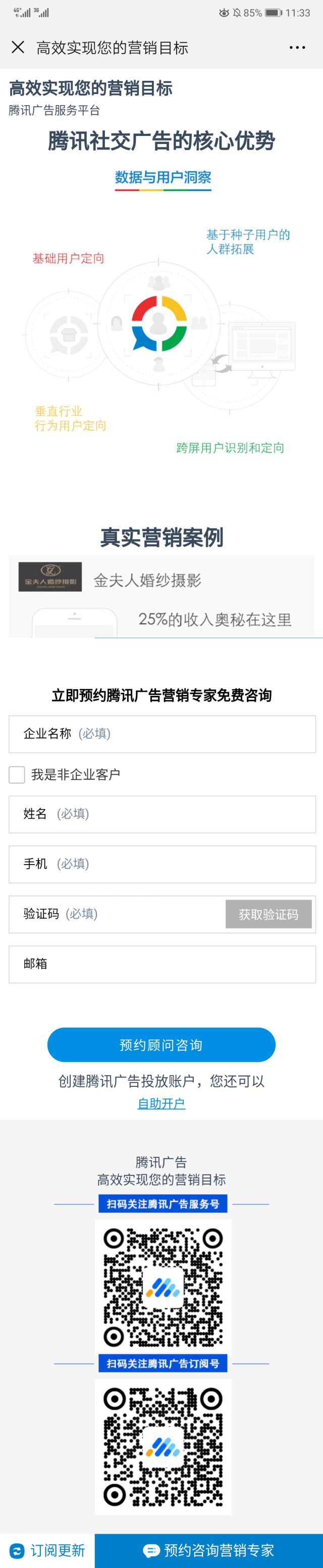 这一页的内容更有意思啦! 这一页先是跟用户讲述了四大核心优势: 1.基础用户定向; 2.基于种子用户的人群拓展; 3.垂直行业行为用户定向; 4.跨屏用户识别和定向。 除了讲述优势以外,还有成功案例和广告案例供你参考! 并且腾讯广告落地页的表单内容更加丰富,如果大家需要投放腾讯社交广告,就需要填写自己的联系方式,如果大家需要预约咨询腾讯广告营销专家,填写表单就可以啦! 并且在广告落地页的下方,还会说邀请用户自助开户,以及放置企业二维码等等。