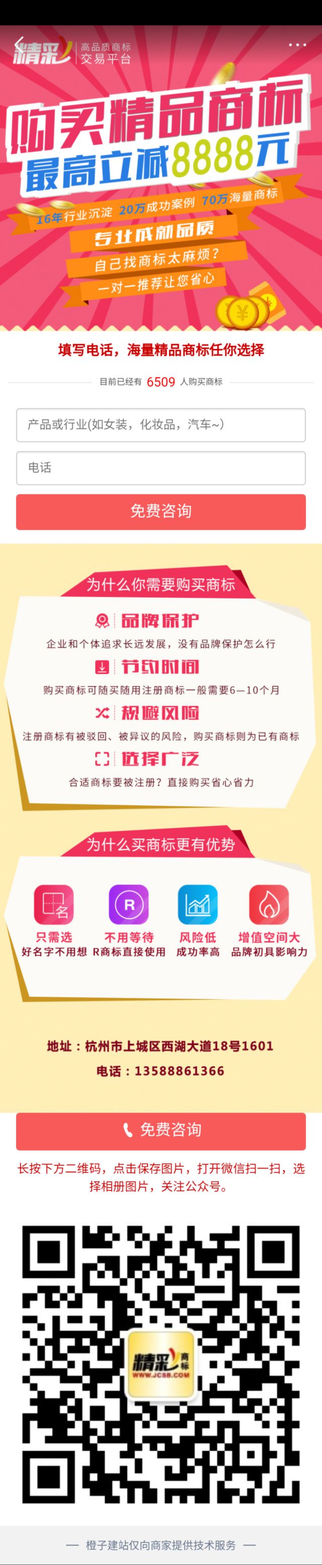 这一页最引人注目的就是精彩商标推出的价格优惠,只要购买精品商标就能够立减8888元!而我们如果想要领取优惠/在线咨询,就可以填写自己的联系方式就可以啦! 虽然说注册商标都是需要的,但是很多朋友都不是很明白,为什么一定要购买商标? 那么我们就可以看看精彩商标给出的理由啦。比如品牌保护、节约时间、规避风险、选择广泛等等。 并且广告主在这里还向大家解释了为什么选择购买商标会占据优势?比如只需选,不用等待,风险低,增值空间大等等。 并且在广告落地页的最后,还有精彩商标的联系电话、地址和企业官方二维码,所以在这里是有助于引导用户产生广告互动,产生咨询等等。 以上就是今日份的广告案例啦!