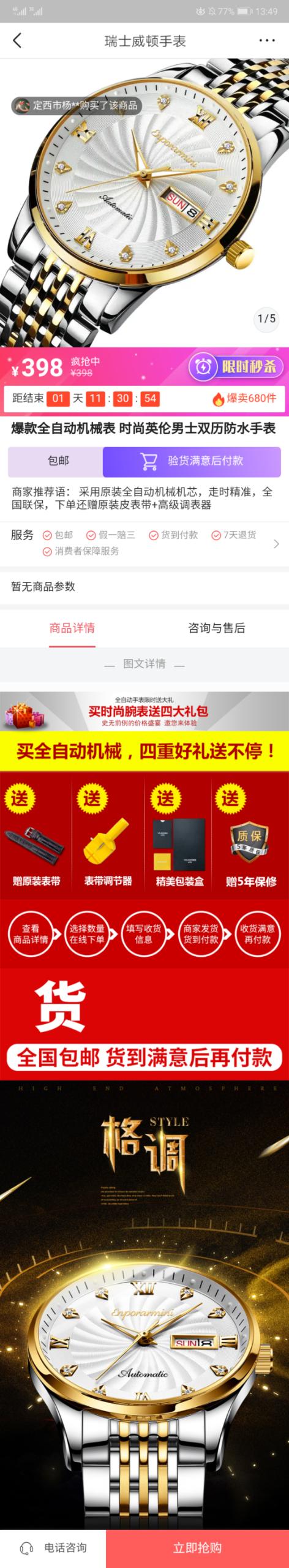呐,这个页面就直接是手表的购买链接,通过这一页面,我们可以看到手表外观材质,还可以看到细节特征,并且还可以查看手表的详细信息。我们还可以直接通过这一链接来做产品购买! 电商行业的广告主们如果要做广告投放,广告展现样式和本文的案例类似,但是我们在选择产品做广告推广时,产品单价不宜过高,并且需要提升产品的实用性,只有这样广告投放也才会更有价值!