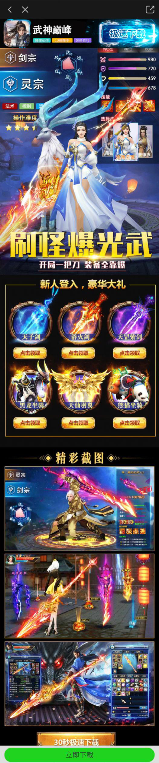 广告落地页: 点击广告进入落地页,里面是游戏的详细介绍、新人礼和游戏精彩画面的截图,点击下方绿色“立即下载”按钮就可以直接下载了,如果用户是在WiFi环境下可以直接下载,如果是4G流量的情况下是会有小红书发展提示的。